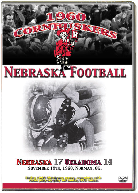 November 19th, 1960, Norman, OK. The struggling Huskers once again put the hurt on the Sooners, this time in Norman! 17-14 victory. NU overcomes a 14-0 halftime deficit with the help of Thunder Thorntons 68 yard TD jaunt and Ron Meades go-ahead field goal with 1:38 left. Entire game footage, black and white, complete with Lyell Bremser and Joe Patrick radio play by play for audio. Produced by Paul Jacobsen. DVD video, 104 minutes.