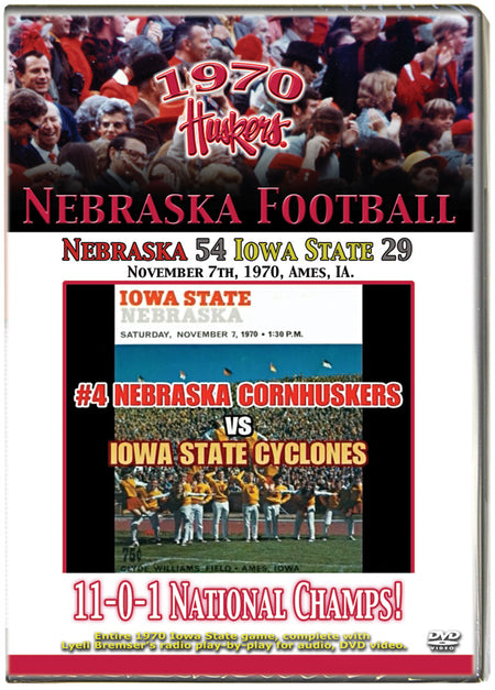 November 7th, 1970, Ames, IA. Despite a game Cyclone squad and a boisterous home crowd, Big Red rolls early and often, amassing 565 yards in offense. Jerry Tagge connects on 18 of 27 tosses for 223 yards and 2 TDs. Kinney rushes for 119, and the likes of Rodgers and Ingles snag a few balls. B&W and Color footage complete with Bremsers radio play by play for audio. Produced by Paul Jacobsen. DVD video, 138 minutes.