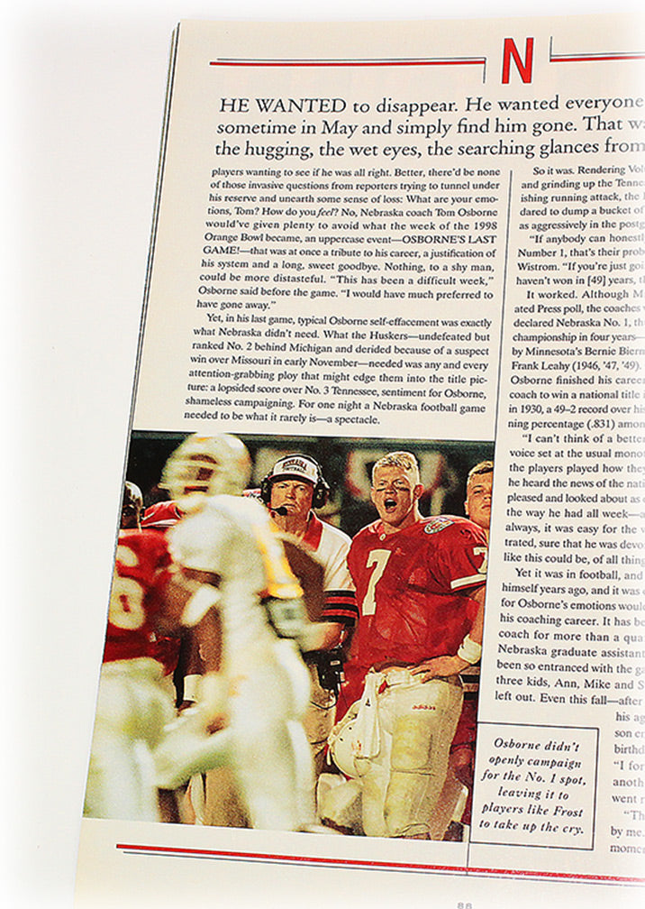 Sports Illustrated commemorates coach Osbornes career. Hand signed by coach Osborne one-of-a-kind collectible. Spectacular photos and well-written commentary cover all 25 seasons. Certificate of authenticity included. Very rare, only 1 left!!