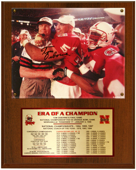 Features photo of coach Osborne's final moments on the sideline. Attached brass plate details all of coach Osborne's career accomplishments. Photo signed by coach Osborne. Certificate of authenticity included. 12 inch x 15 inch cherry finished plaque.