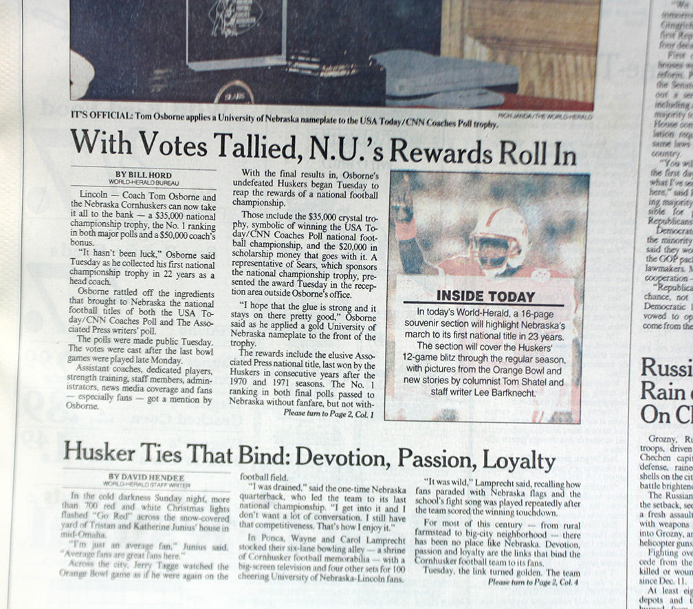 January 4th, 1995 Omaha World Herald. Full issue newspaper hand signed by coach Osborne on front page with photo of sears trophy. One of a kind item. Certificate of Authenticity included.