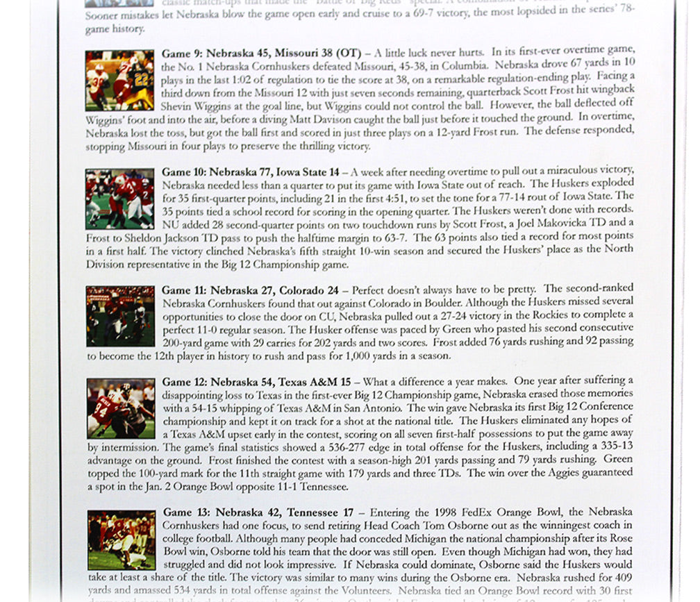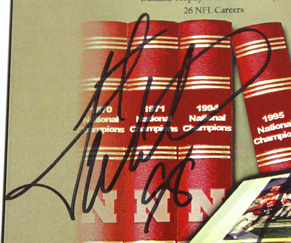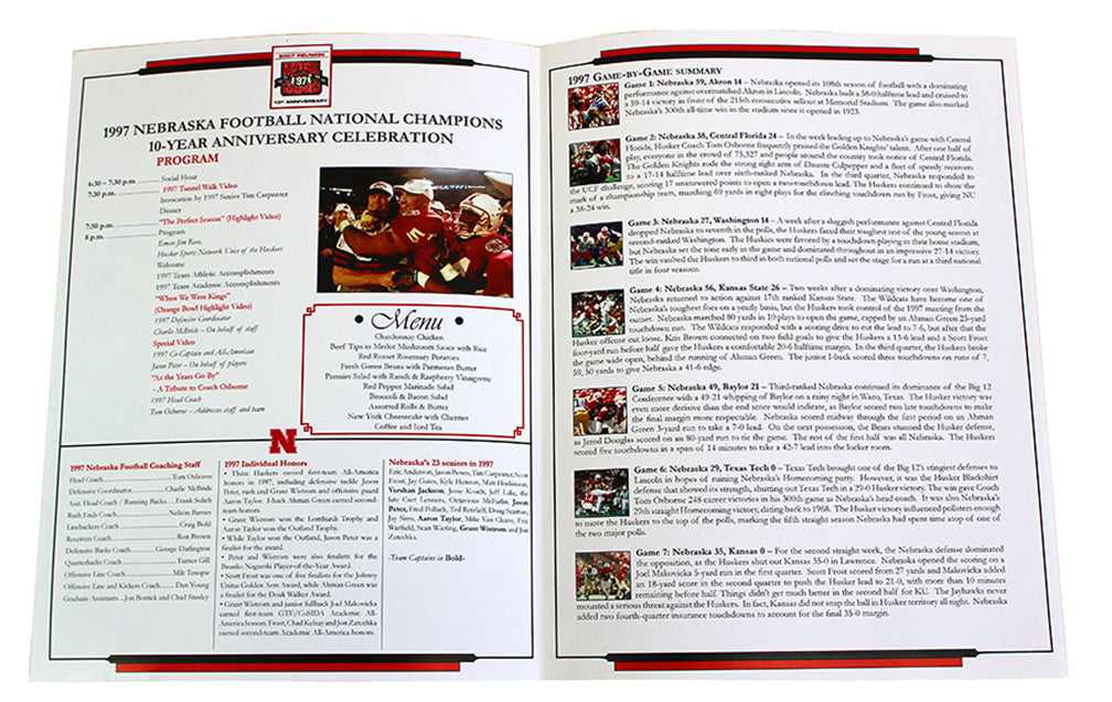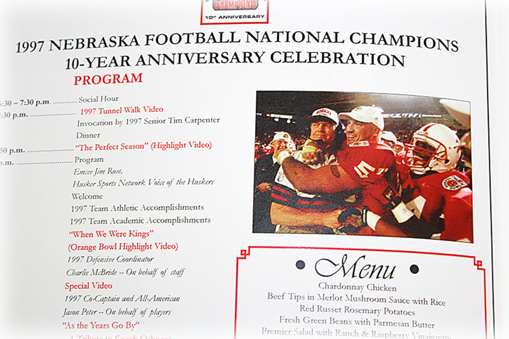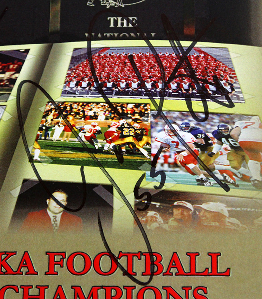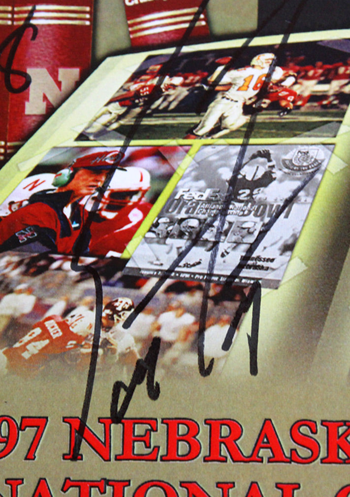 Authentic 1997 Championship Reunion Celebration Banquet Program. Very rare program from the official 10 year reunion organized and hosted by the Nebraska athletic department, and part of the festivities that saw the 1997 team lead the Huskers onto the field and many enjoyable reminiscences. Entire reunion banquet program including game by game reviews of the historic '97 season. New condition. Only 12 available. Hand signed by the four men most responsible for NU's last undefeated season and the throttling of Peyton Mannings Tennessee Volunteers: Scott Frost, Tom Osborne, Grant Wistrom, and Jason Peter. Certificate of authenticity included.