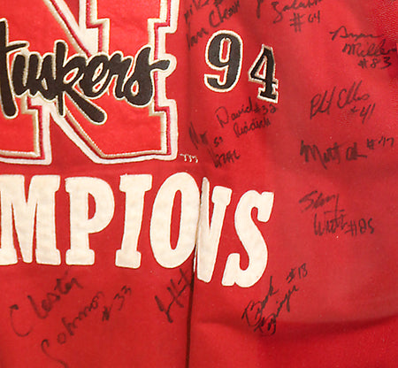 One of a kind item from the team that was all about Finished Business. The 1994 season climaxed in maybe the most inspiring and euphoric win in Big Red History as Nebraska overcame the demons of the Orange Bowl, Warren Sapp and his Hurricane buddies in Husker grind 'em down fashion with a 24-17 come from behind National Championship victory. Hand-signed letterman embroidered '94 Champs jacket, including autographs from Tommie Frazier, Tom Osborne, Aaron Taylor, Sheldon Jackson, Tony Veland, Tyrone Williams, Christian Peter, Ahman Green, Clinton Childs, Jared Tomich, Jeff Makovicka, Phil Ellis, Grant Wistrom, Lawrence Phillips, Brook Berringer, Clester Johnson, Jesse Kosch, and others. Shadow box 44 by 36 inches.