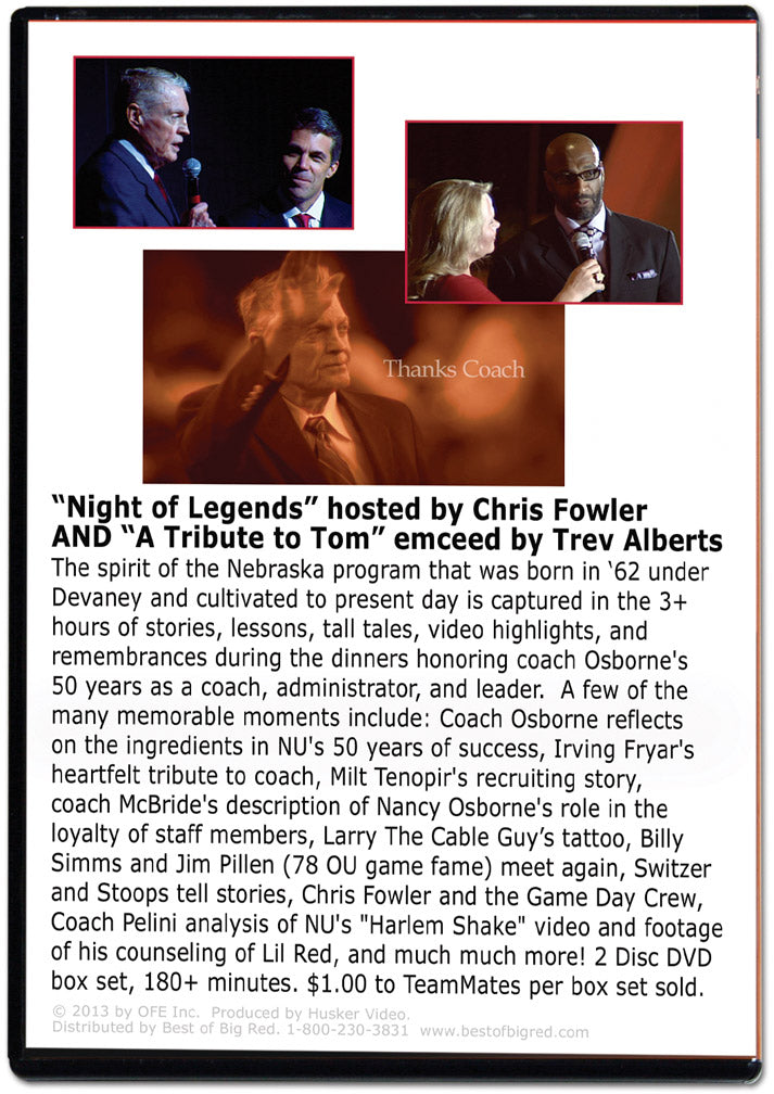 Spring 2013 retirement gala events: “Night of Legends” hosted by Chris Fowler AND “A Tribute to Tom” emceed by Trev Alberts. The spirit of the Nebraska program that was born in ‘62 under Devaney and cultivated to present day is captured in the 3+ hours of stories, lessons, tall tales, video highlights, and remembrances during the 2 banquets honoring coach Osborne's 50 years as a coach, administrator, and leader. A few of the many memorable moments include: Coach Osborne reflects on the ingredients in NU's 50 years of success, Irving Fryar's heartfelt tribute to coach, Milt Tenopir's recruiting story, coach McBride's description of Nancy Osborne's role in the loyalty of staff members, Larry The Cable Guy’s tattoo, Billy Simms and Jim Pillen (78 OU game fame) meet again, coach Switzer and Stoops tell stories, Chris Fowler and the Game Day Crew, Coach Pelini analysis of NU's "Harlem Shake" video and footage of his counseling of Lil Red, and much much more! 2 Disc DVD box set, 180+ minutes of never before seen footage. $1.00 to TeamMates Mentoring Program per box set sold.